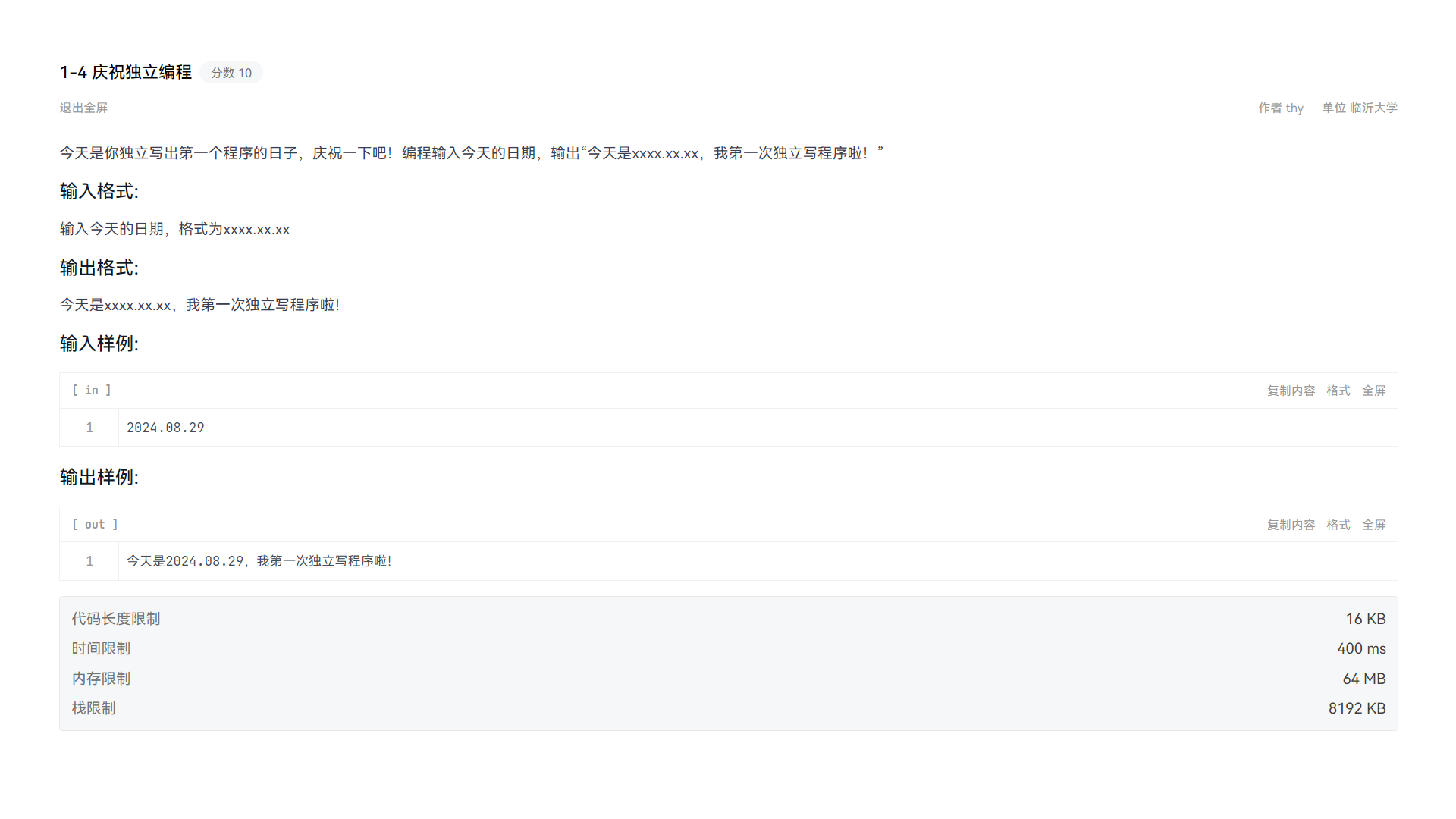 print(f"今天是{todaydate},我第一次独立写程序啦!")第五题